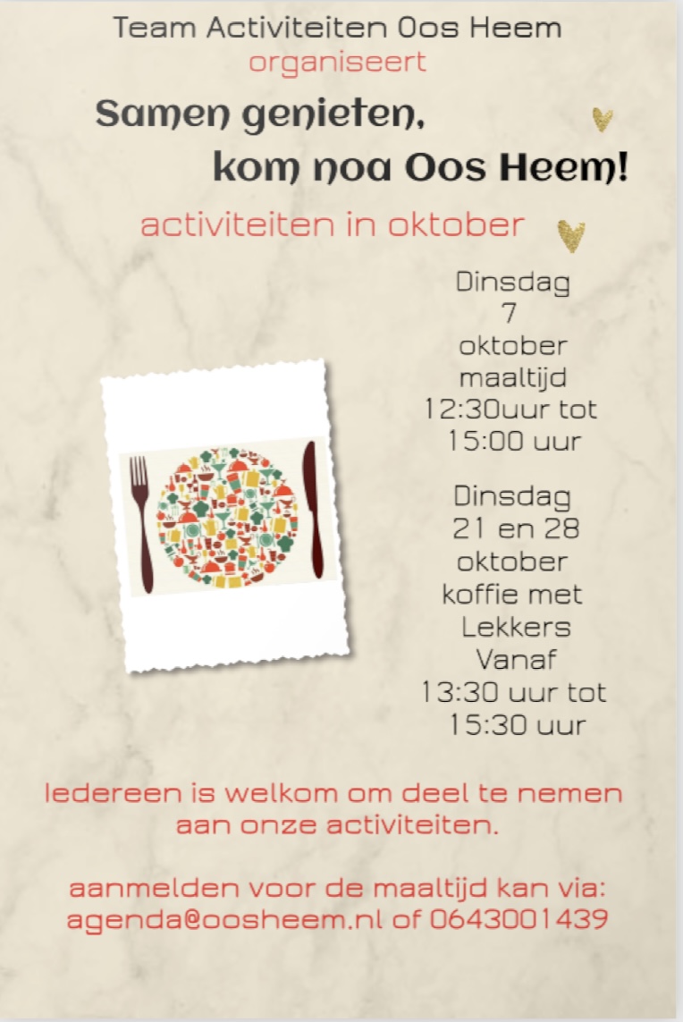 De lunch is deze eerste keer helemaal gratis! 🎉 Maar let op: de plaatsen zijn beperkt, en vol is vol. Meld je daarom aan vóór 18 oktober via info@oosheem.nl of bel ons op 06-43001439