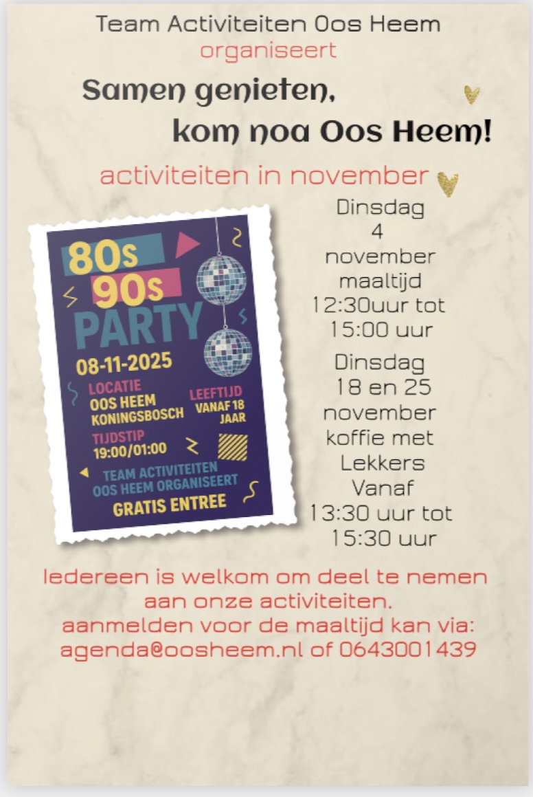 Welkom bij Oos Heem, het bruisende centrum van onze gemeenschap in Koningsbosch! Hier vindt u een overzicht van de diverse activiteiten die we aanbieden. We nodigen iedereen uit om deel te nemen en samen een gezellige tijd te beleven.